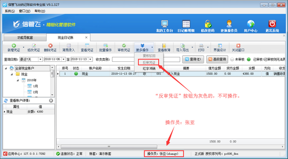 ????保存權(quán)限后,更換操作員,選擇操作員“王五”登錄軟件,新增一個(gè)現(xiàn)金日記賬,保存日記賬后,在現(xiàn)金日記賬列表中可以看到“審核憑證”按鈕為灰色,無法進(jìn)行審核操作,如下圖2所示: