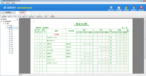 ????出納記賬軟件下載安裝完成后,使用演示賬套中的資金賬戶登記現(xiàn)金日記賬,在現(xiàn)金日記賬界面,點(diǎn)擊“查看賬簿”,可進(jìn)入現(xiàn)金賬簿界面,如下圖1所示,可看到核算單位顯示:亞拓辦公用品公司,如果需要修改為自己公司信息,該如何修改?本文以“信管飛出納記賬軟件”為例,示范如何修改現(xiàn)金賬簿中的核算單位。