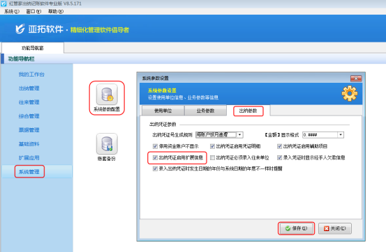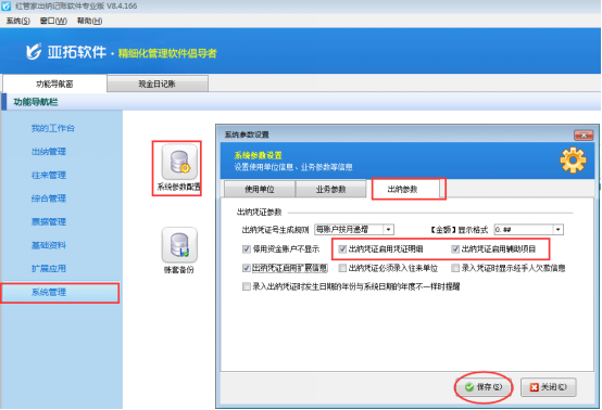 ????在功能導(dǎo)航窗點(diǎn)擊“系統(tǒng)管理”—》“系統(tǒng)參數(shù)配置”—》“出納參數(shù)”打開出納參數(shù)配置界面,然后啟用參數(shù)“出納憑證啟用憑證明細(xì)”、“出納憑證啟用輔助項(xiàng)目”,如下圖所示。