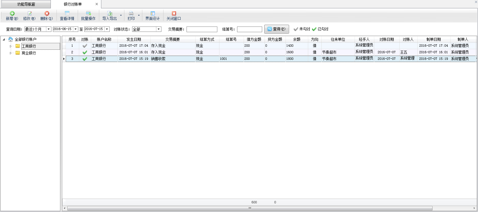 批量操作:在工具欄中點(diǎn)擊“批量操作”按鈕,系統(tǒng)會(huì)進(jìn)行批量操作模式,可以快速選擇多個(gè)銀行日記賬或者銀行對賬單,進(jìn)行批量勾對或批量取消勾對操作。