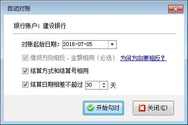 自動(dòng)對賬:點(diǎn)擊工具欄中的“自動(dòng)對賬”按鈕,系統(tǒng)會(huì)彈出“自動(dòng)對賬”窗口,如圖2所示,設(shè)置對賬起始日期及對賬選項(xiàng)后點(diǎn)擊“開始勾對”即可。