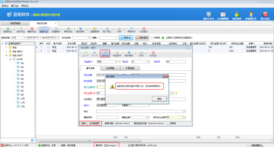 ????設(shè)置操作員權(quán)限之后,操作員“張亞”登錄軟件,在功能導(dǎo)航窗點(diǎn)擊“出納管理”—》“現(xiàn)金日記賬”,進(jìn)入現(xiàn)金日記賬界面,選擇一個(gè)制單人為其他人員的日記賬憑證,然后點(diǎn)擊“修改憑證”按鈕,系統(tǒng)提示“當(dāng)前憑證為其他操作員錄入的,您沒有權(quán)限修改!”,如圖所示。操作員“張亞”可以查看其他操作員所開的憑證信息,但在查看窗口同樣無法修改憑證信息,如圖所示: