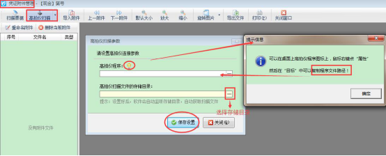 ????在紅管家出納記賬軟件中,進(jìn)入附件管理窗口,點(diǎn)“高拍儀掃描”-》“高拍儀掃描參數(shù)配置”,配置高拍儀程序以及掃描文件存儲(chǔ)目錄,如下圖所示:
