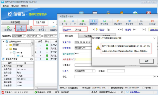 ????期末結(jié)賬后,在功能導(dǎo)航窗,點(diǎn)擊“出納管理”——》“現(xiàn)金日記賬”,進(jìn)入“現(xiàn)金日記賬”界面,選擇現(xiàn)金賬戶“支付寶”8月份的出納憑證(結(jié)賬會(huì)默認(rèn)把未審核的日記賬變?yōu)閷徍耍薷男枰确磳彏槲磳徍藸顟B(tài))點(diǎn)擊“修改”按鈕,彈出的日記賬界面修改后點(diǎn)擊“保存”時(shí)會(huì)提示“當(dāng)前賬期是2021年第9期,錄入的發(fā)生日期小于賬期的起始日期,請修改后再保存”,則無法修改之前賬期的憑證。如下圖所示: