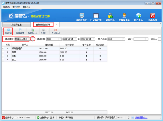 ????在“日記賬綜合統(tǒng)計(jì)”界面,統(tǒng)計(jì)類型選擇“按經(jīng)手人統(tǒng)計(jì)”,然后點(diǎn)擊“統(tǒng)計(jì)”按鈕,可以根據(jù)經(jīng)手人進(jìn)行統(tǒng)計(jì)。另外,系統(tǒng)支持根據(jù)日期、賬戶名稱、部門、經(jīng)手人等條件進(jìn)行統(tǒng)計(jì)查詢。