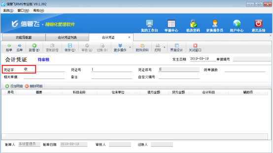 ????再次新增會計憑證時,就會自動顯示設(shè)置的默認(rèn)憑證字,如下圖所示: