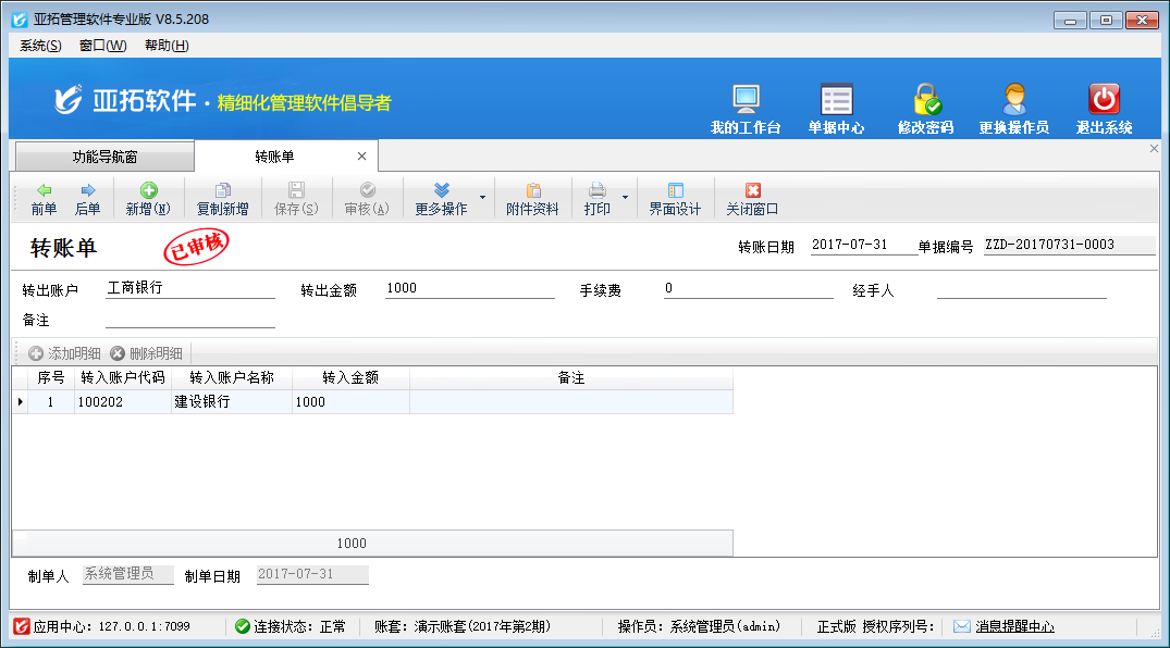 ????點亞拓管理軟件專業(yè)版內(nèi)包含有財務(wù)處理模塊,其中轉(zhuǎn)賬單主要用于實現(xiàn)不同資金賬戶之間的資金劃撥,轉(zhuǎn)賬單不影響總的資產(chǎn)總額(有轉(zhuǎn)賬手續(xù)費的除外),本篇文章我們來介紹一下轉(zhuǎn)賬單的使用方法。