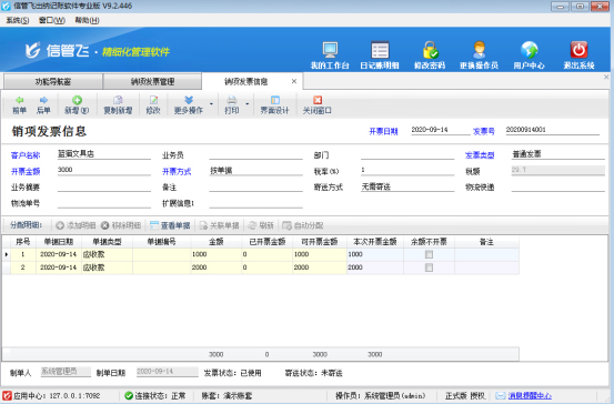 ????默認新增的記錄是未開票狀態(tài),返回功能導(dǎo)航窗,點擊“票據(jù)管理”—》“銷項發(fā)票管理”界面上點擊“新增發(fā)票”,在新增界面選擇客戶“測試客戶”,開票方式選擇“按單據(jù)”,點擊“添加明細”按鈕,選擇界面發(fā)票類型選擇“全部”,勾選應(yīng)收款明細記錄。輸入開票金額后點擊分配明細,把開票金額分配至“本次開票金額”中,然后輸入發(fā)票號保存單據(jù),如下圖所示: