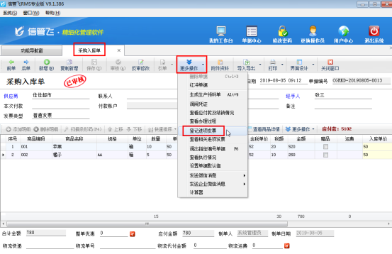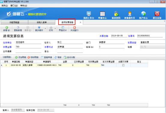 ????發(fā)票管理為擴展模塊,只有信管飛RMS標準版和專業(yè)版支持附加使用。填開發(fā)票除了在發(fā)票管理中直接進行新增,軟件也支持在開單界面直接填開發(fā)票操作。本文以信管飛RMS專業(yè)版的采購入庫單為例,講一下在采購入庫單中如何快速填開發(fā)票操作。
