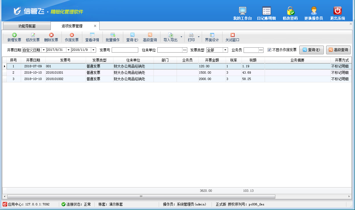 ????進項發(fā)票和銷項發(fā)票是對一般納稅人來說的,一般納稅人購進貨物收取的發(fā)票稱為進項發(fā)票,一般納稅人銷售貨物開出的發(fā)票稱為銷項發(fā)票。企業(yè)在采購和銷售過程中都存在開發(fā)票的情況,信管飛出納記賬軟件專業(yè)版中發(fā)票管理功能可以讓企業(yè)高效快速地管理發(fā)票信息。下面介紹一下進項發(fā)票管理的使用方法。