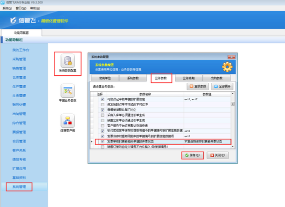 ????系統(tǒng)默認發(fā)票保存時更新業(yè)務(wù)單據(jù)的開票狀態(tài),如需設(shè)置發(fā)票審核后更新業(yè)務(wù)單據(jù)的開票狀態(tài),可在功能導(dǎo)航窗點擊“系統(tǒng)管理”—》“系統(tǒng)參數(shù)設(shè)置”—》“業(yè)務(wù)參數(shù)”中找到并啟用參數(shù)“發(fā)票審核時更新相關(guān)單據(jù)的開票狀態(tài)”(不啟用則發(fā)票保存時更新相關(guān)單據(jù)的開票狀態(tài)),如下圖所示。