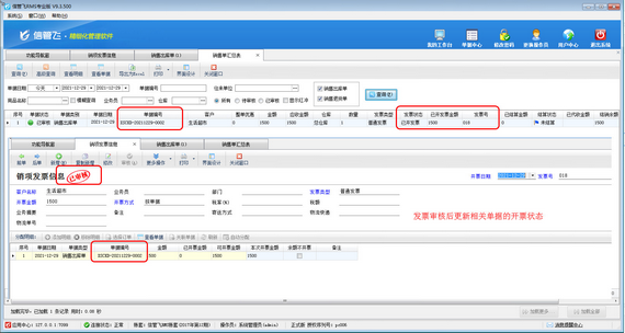 ????發(fā)票審核后系統(tǒng)即可自動更新相關(guān)單據(jù)開票狀態(tài),如下圖所示。