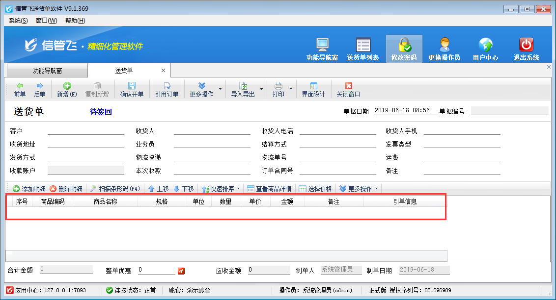 信管飛RMS、信管飛倉庫管理軟件、信管飛送貨單軟件等都提供靈活的界面自定義功能,用戶可根據自身業務要求對軟件界面進行設置,包括配置數據項名稱、啟用擴展數據項、顯示先后順序、設置顯示寬度、對齊方式、是否必填、取值方式及取值設置等。 以送貨單軟件為例,新開送貨單界面默認顯示折扣率%和折扣單價數據項(如下圖所示),部分用戶在開單時不需要顯示折扣率%、折扣單價,會咨詢客服如何去掉這兩項。本文詳細介紹一下如何設置新開送貨單界面不顯示折扣率%和折扣單價? 在送貨單界面工具欄點擊“界面設計”按鈕,打