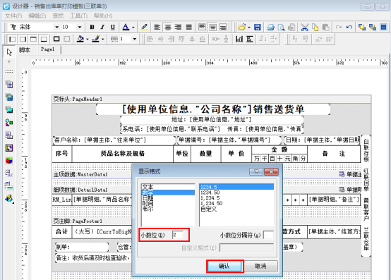 信管飛送貨單軟件、信管飛RMS軟件、信管飛倉庫管理軟件等都支持自定義設計打印模板。打印模板設計中數量的小數位如果需要進行修改,可以在打印格式模板設計界面進行修改。 以信管飛送貨單軟件的模板為例,介紹下如何修改模板中的數量小數位顯示格式。 打開一個送貨單,點擊“打印”—》“打印格式設計”,在打印格式設計界面,選擇示例模板“銷售出庫單打印模版(三聯單3)”,點擊“設計格式”,進入模板設計器界面,如下圖所示:圖1 在模板設計器界面,單擊“細項數據”中的數量