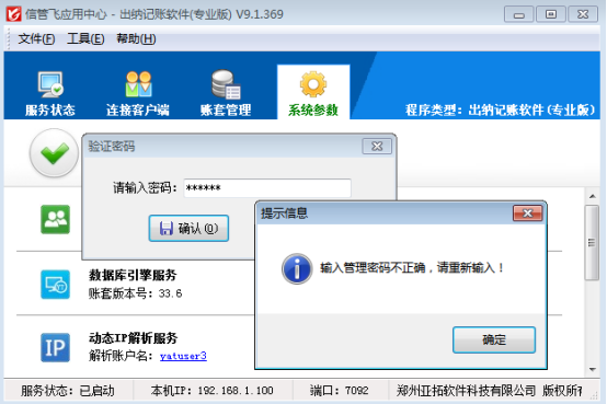 亞拓軟件采用新架構技術開發的信管飛RMS(進銷存軟件)、信管飛送貨單軟件、信管飛出納記賬軟件、信管飛倉庫管理軟件等都包括應用中心及客戶端程序,“應用中心”是系統的管理控制中心,集中管理連接客戶端和賬套數據庫,從而實現數據的集中存儲和實時共享,應用中心主要包括運行狀態管理、連接客戶端管理、賬套管理、系統參數設置以及其他管理功能。 應用中心的管理和配置會對軟件的運行產生重大影響,因此軟件提供增強安全驗證功能,啟用安全驗證后執行賬套管理、系統參數設置等功能時會要求輸入密碼,驗證密碼通過后才可以進行相應操作。下面我們以信管飛出納