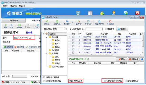 信管飛倉庫管理軟件、信管飛RMS軟件等都支持開單時選擇系統已錄入的商品信息,進行快速選擇多個商品開單,在選擇商品的時候默認顯示的是所有商品(如圖所示),有部分客戶想在選擇商品窗口僅顯示出此客戶的相關產品,本文我們以“信管飛倉庫管理軟件”為例示范下如何在選擇商品窗口僅顯示客戶相關商品。 在功能導航窗點擊“系統管理”—》“系統參數配置”—》“業務參數”,即可進入到“業務參數”配置界面,在數據選擇參數內打鉤啟用“在選擇商品窗口顯示客戶相關商品”參數,然后點擊“保存”按鈕保存設置,如下圖所示: