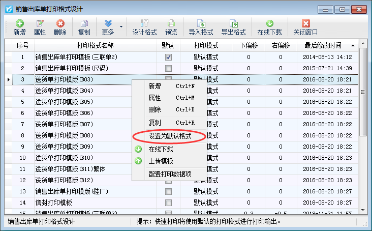 信管飛送貨單軟件、信管飛RMS軟件、信管飛倉庫管理軟件等在軟件內都內置了多種打印格式,除此之外,軟件也支持自定義設計打印格式模板,為了開單打印單據方便,軟件可以把常用的模板設置為默認模板,開單保存后直接進行打印操作。不需要再次選擇模板進行打印。 本文以信管飛RMS為例,示范下如何設置常用的打印模板為默認模板。首先打開銷售出庫單打印格式設計界面,在單據界面,點擊工具欄中的“打印”—》“打印格式設計”進入銷售出庫單打印格式設計界面,在此界面進行設置默認打印格式模板操作。有以下三種操作形式: