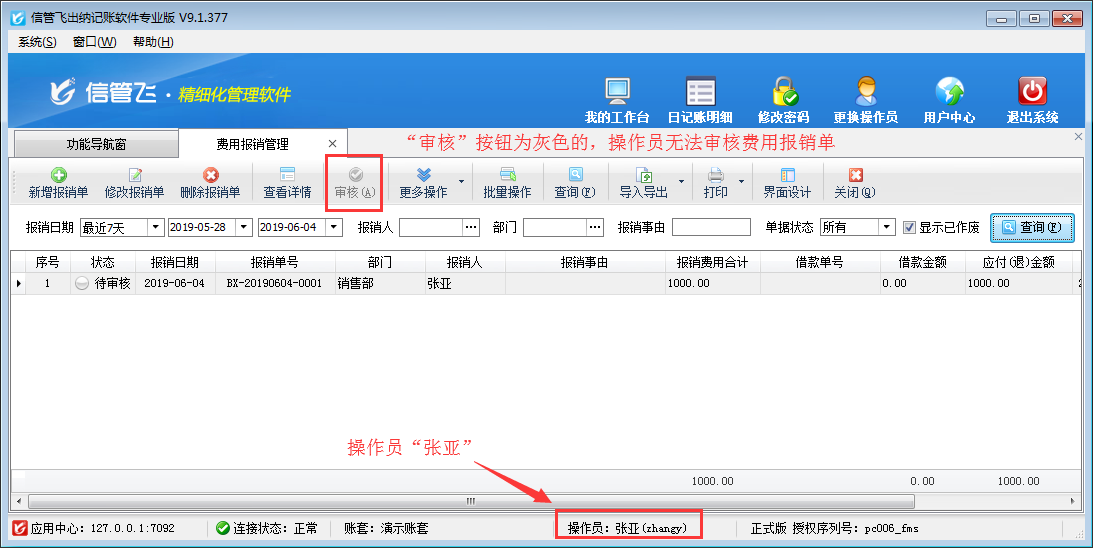 在日常工作中,因為臨時事件的發生,員工經常會自己墊付工作所需要的各項費用。這些費用在月末時可以填寫費用報銷單進行統一的報銷。信管飛出納記賬軟件專業版有費用報銷管理功能,可以管理費用報銷單,并支持設置操作員費用報銷單審核權限,下文我們詳細介紹一下出納記賬軟件內如何設置操作員不允許審核費用報銷單?    在功能導航窗點擊“系統管理”—》“操作員及授權”打開操作員管理及授權界面,選擇操作員“張亞”,在功能模塊權限界面,選擇“綜合管理”—》“費用報銷管理”,把費用報銷管理“審核”權限勾選取消后保存權限,如下圖一所示:圖一 &