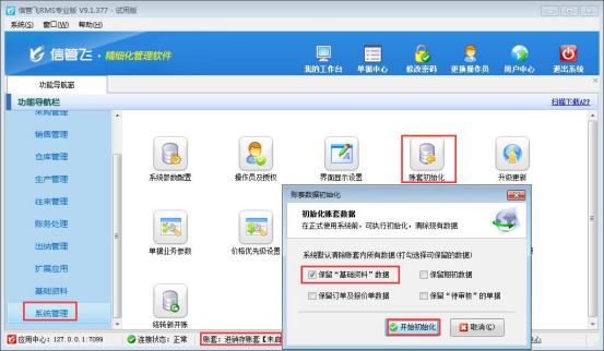 信管飛倉庫管理軟件、信管飛RMS軟件(星光版、標準版、專業版)都含有賬套管理功能,支持建立多個賬套。在正式使用軟件前我們建議新增一個新賬套,用于重新錄入和管理數據(如何新增賬套并登錄新賬套可參考文章:進銷存軟件中如何新建賬套?)     在賬套未啟用(開賬)之前是無法錄入業務單據的,只能錄入基礎資料(員工信息、供應商信息、客戶信息、商品信息、倉庫信息等)和期初數據(期初庫存單),在完成期初數據錄入后,就可以啟用賬套(即開賬),在功能導航窗點“基礎資料”—》“啟用賬套”,然后點“啟用賬套”,即可進行期初開賬
