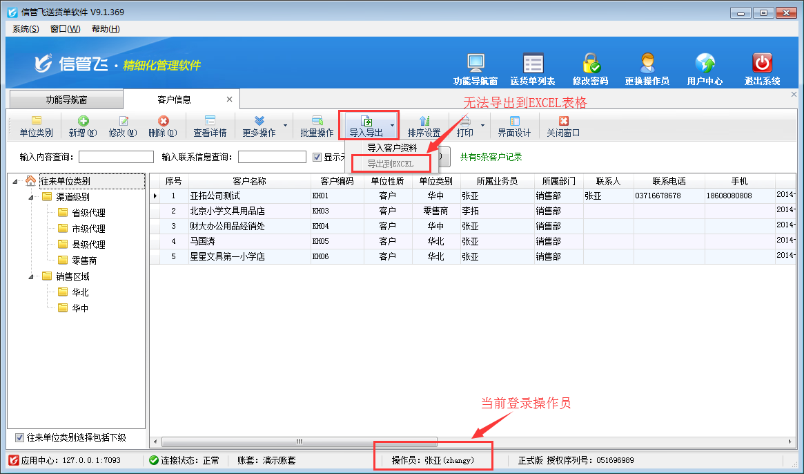 信管飛送貨單軟件、信管飛RMS、信管飛倉庫管理軟件等都支持管理基礎資料信息和允許設置多個操作員進行登錄軟件。軟件支持將基礎資料信息以EXCEL的形式導出放到自定義的文件夾內以供備份或保存,如果需要設置操作員不允許導出客戶信息,如何設置?本文以信管飛送貨單軟件為例,示范下如何設置操作員不可導出客戶信息。    在功能導航窗點擊“系統管理”—》“操作員及授權”打開操作員管理及授權界面,選擇操作員“張亞”,在功能模塊權限界面,選擇“基礎資料”—》“客戶信息”,在導出權限下,把客戶信息“導出”權限勾選取消后保存權限,如下圖1所示:圖1