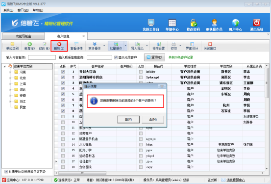 信管飛RMS(進銷存軟件)支持維護客戶信息,出現客戶信息大范圍錄入錯誤時,軟件支持對錯誤客戶資料進行批量刪除操作,避免一個一個刪除的麻煩。以信管飛RMS專業版為例示范下如何操作?    在功能導航窗選擇“基礎資料”—》“客戶信息”進入客戶信息管理界面,選擇工具欄的“批量操作”按鈕,進入批量操作模式,選擇需要刪除的客戶信息(批量操作支持全選、全不選、反選),如下圖所示:圖1    批量選擇客戶信息后,點擊工具欄的“刪除”按鈕,會提示“您確定要刪除當前選擇的客戶記錄嗎?”,點擊“是”進行批量刪除操作。