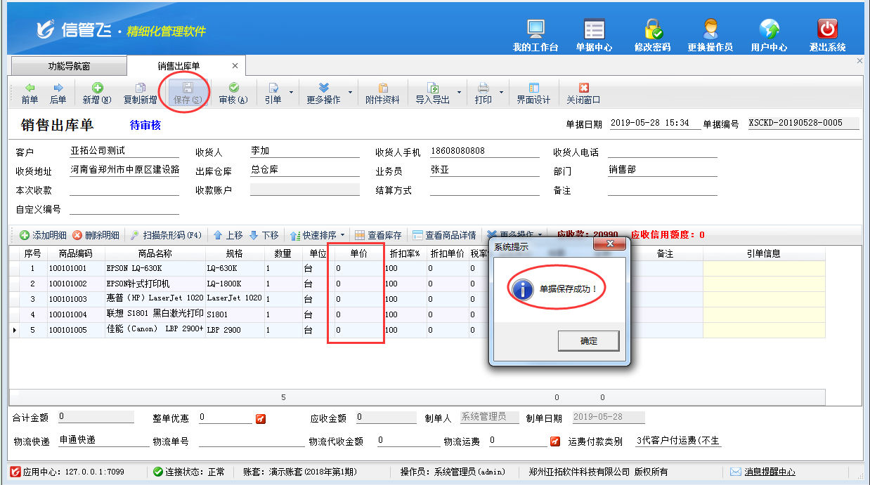 演示視頻觀看鏈接:如何設置出庫單保存時商品單價為0系統不彈出提示信息?   信管飛RMS、信管飛倉庫管理軟件、信管飛送貨單軟件等在業務單據保存時如果商品單價為0,系統會彈出提示信息,是否需要繼續保存,如下圖一所示,這樣以免用戶在添加商品明細時忘了填寫單價,好及時錄入,但是有一部分用戶在開單據時只需要填寫商品數量,不需要填寫單價,該怎么設置系統才能不彈出以下提示信息呢?本篇文章以信管飛RMS專業版為例介紹一下如何設置出庫單保存時商品單價為0系統不彈出提示信息?圖一 銷售出庫單界面    在功能導航窗點擊“系統