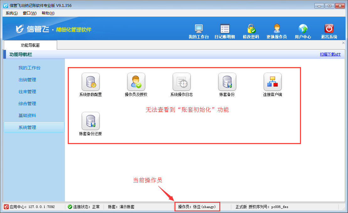 賬套初始化一般用于在正式使用軟件前,對賬套中的數(shù)據(jù)進行初始化,以便重新錄入數(shù)據(jù)。一般在試用軟件期間會輸入一些試用的數(shù)據(jù),比如現(xiàn)金日記賬憑證、銀行日記賬憑證或一些應收應付款信息,當您試用結束后想刪除這些無用的數(shù)據(jù)錄入新數(shù)據(jù)時,可以通過本系統(tǒng)的“帳套初始化”功能來一次性清除,方便快捷(如下圖所示)。 執(zhí)行賬套初始化操作后,會刪除賬套內相應的數(shù)據(jù),因此務必提前做好備份,謹慎操作!為了避免操作員誤操作,導致數(shù)據(jù)丟失,軟件內支持設置操作員不可進行賬套初始化操作,下面以信管飛出納記賬軟件專業(yè)版為例來演示一下具體的操作步驟。