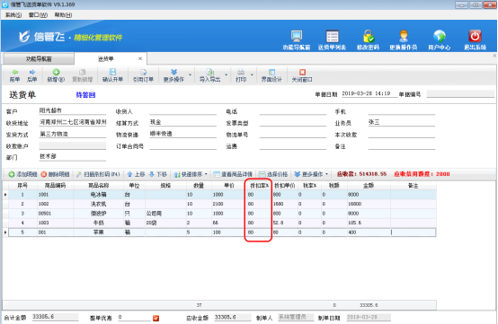 信管飛送貨單軟件、信管飛倉庫管理軟件、信管飛RMS開單時,當商品存在打折情況時,支持錄入商品的折扣率。當商品明細的內容比較多時,為了快速開單,提高效率,可以批量更新單據(jù)明細中的折扣率。 下面我們以信管飛送貨單軟件為例詳細介紹下如何批量修改商品折扣率。 登錄軟件,在功能導航窗點“業(yè)務處理”—》“新開送貨單”,進入新開送貨單界面,錄入商品信息,默認的折扣率是100%,如圖1所示:圖 1 在單據(jù)明細上方,點擊“更多操作”—》“修改商品折扣”,彈出修改商品折
