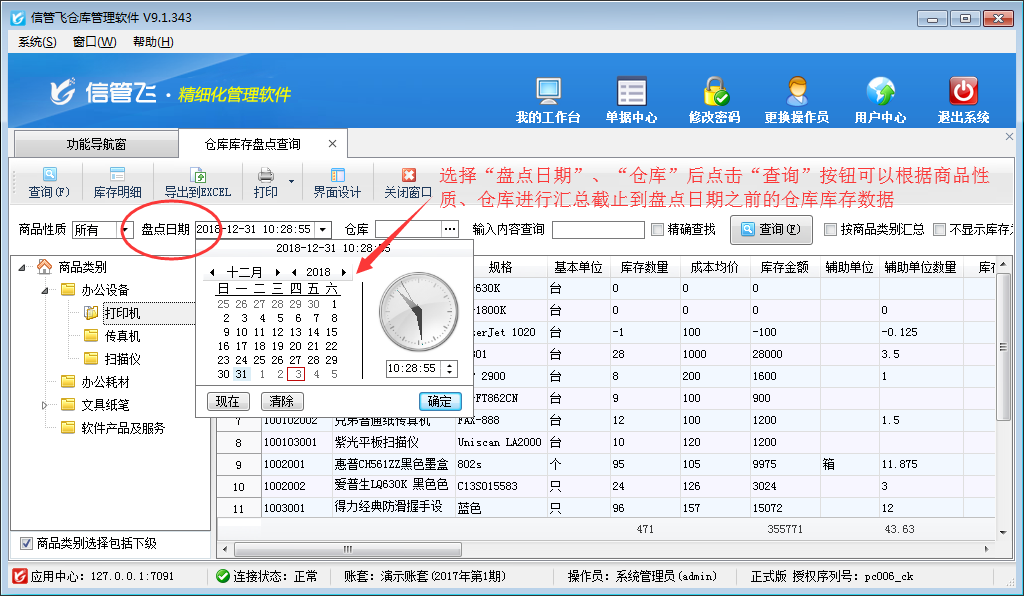 信管飛倉庫管理軟件和信管飛RMS都可以對倉庫信息進行管理,都可以查詢商品實時庫存和歷史庫存數量。倉庫庫存查詢可以查看存貨的實時庫存情況,庫存盤點查詢可以按照指定的盤點日期查詢截止到盤點日期之前不同倉庫內存貨的庫存數量,包括庫存數量、可用庫存數量、待入庫數量、待出庫數量,并可查看庫存成本情況,支持按照倉庫、商品性質等條件進行匯總。本篇文章以信管飛倉庫管理軟件為例詳細介紹一下如何查詢商品歷史庫存數量。 在功能導航窗點“倉庫管理”—》“相關查詢統計”—》“庫存盤點查詢”,即可進入倉庫庫存盤點查詢界面,如下圖所示。圖1圖2&nb