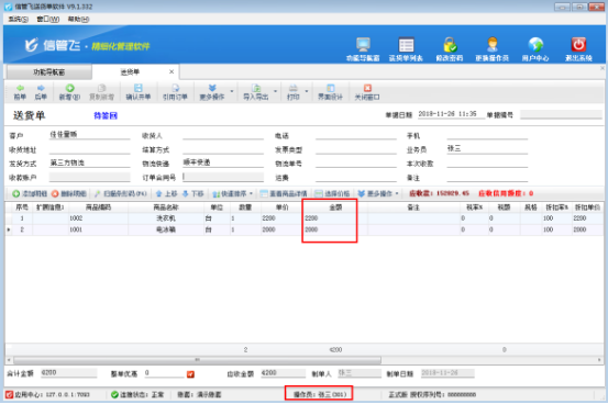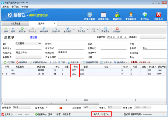 信管飛送貨單軟件、信管飛RMS、信管飛倉庫管理軟件等默認開單時金額信息允許修改,為了避免操作員開單時出現金額修改錯誤情況,軟件支持設置操作員不可修改銷售金額的權限。以“信管飛送貨單軟件”為例,講一下如何設置操作員不可修改銷售金額。 在功能導航窗選擇“系統管理”—》“操作員及授權”,進入操作員管理及授權界面,以操作員“張三”為例,選擇操作員后,點擊“其他操作權限”,取消勾選“可修改銷售金額”,然后保存設置,如圖1所示。圖1 保存完成后,退出軟件,切換到操作員“張三”登錄軟件,在“業務處理