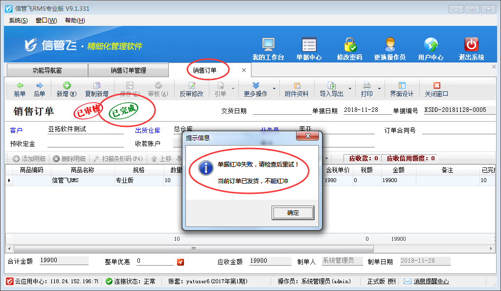 信管飛RMS、信管飛送貨單軟件內都支持設置已發貨的銷售訂單不可進行修改、紅沖操作,本篇文章以信管飛RMS為例詳細介紹一下如何設置已發貨的訂單不可修改不可紅沖? 在功能導航窗點擊“系統管理”→“系統參數設置”→“業務參數”可以打開“業務參數”配置界面,在業務單據相關參數內打鉤啟用“已發貨的訂單不可修改不可紅沖”參數,然后點擊“保存”按鈕保存設置,如下圖1所示。圖1 系統參數設置界面 設置完成后,點擊“銷售管理”→“銷售訂單”打開銷售訂單列表界面,然后打開一個已發貨完成的訂單反