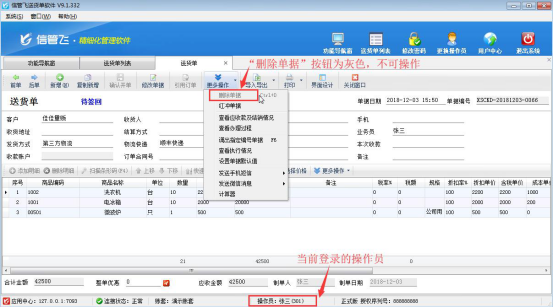 信管飛送貨單軟件中支持刪除單據,送貨單保存后如發現填寫錯誤,可以刪除,如圖1所示。圖1 如果需要操作員不可刪除送貨單,軟件也支持設置操作員不可刪除送貨單權限,下面以來演示一下設置操作員不可刪除送貨單權限的操作步驟。 登錄軟件,在功能導航窗點擊“系統管理”—》“操作員及授權”,進入“操作員管理及授權”界面,選擇操作員“張三”,在其右側的功能模塊權限內選擇“業務處理”模塊,將“新開送貨單”和“送貨單列表”的“刪除”權限取消勾選,然后保存設置,如圖2、圖3所示。圖2圖3