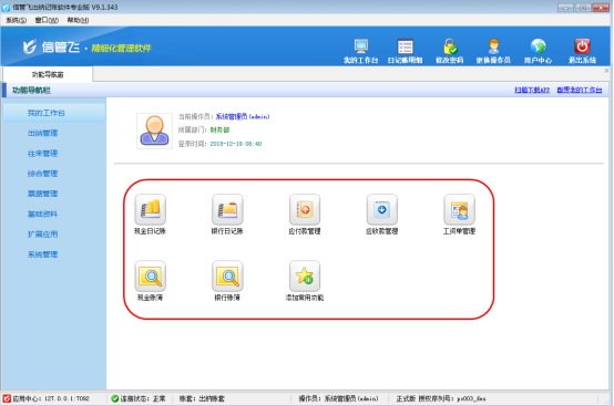 亞拓軟件開發的信管飛出納記賬軟件、信管飛RMS、信管飛倉庫管理軟件、信管飛票據打印軟件等都包含我的工作臺功能,我的工作臺中可以查看當前操作員信息,并且可以添加一些常用的功能模塊。下面我們以信管飛出納記賬軟件專業版為例詳細介紹下我的工作臺功能是如何使用的。 首先登錄軟件,點擊“功能導航窗”—》“我的工作臺”,可以打開我的工作臺界面,如下圖所示:圖1 我的工作臺界面 在我的工作臺界面,首先可以查看當前操作員信息,另外點擊“添加常用功能”按鈕可以添加當前操作員有權限的常用功能(點擊右上角“配