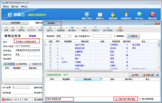信管飛RMS軟件、信管飛倉庫管理軟件和信管飛送貨單軟件開單時都支持選擇系統內已錄入的商品信息,進行快速選擇商品來開單。選擇商品時在選擇商品窗口默認是可以顯示所有商品(圖1),但是部分用戶在選擇商品時只需要顯示此客戶相關的商品,如何設置呢?本篇文章我們以信管飛RMS 專業版軟件為例來詳細介紹一下如何設置在選擇商品窗口僅顯示客戶相關商品? 圖1 在功能導航窗點擊“系統管理”—》“系統參數配置”—》“業務參數”,即可進入到“業務參數”配置界面,在數據選擇參數內打鉤啟用“在選擇商品窗口顯示客戶相