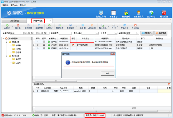 信管飛倉庫管理軟件可以對銷售單列表、采購單列表、銷售訂單列表、采購訂單列表進行標記備注。如果不允許操作員標記單據備注,可以對操作員取消“標記單據備注”的權限。下面我們介紹一下在信管飛倉庫管理軟件中設置操作員不可標記單據備注的操作步驟。 系統管理員登錄軟件后,在功能導航窗點“系統管理”—》“操作員及授權”即可進入“操作員管理及授權”界面,如圖1所示。選擇操作員“張亞”后,點擊“其他操作權限”,去掉勾選“標記單據備注”,然后保存權限設置。圖1 操作員權限設置后 ,用操作員“張亞”賬號登錄軟