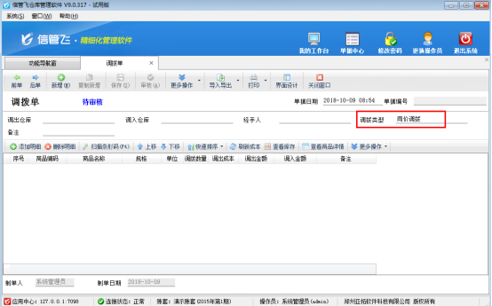 調撥單主要用于庫存商品在各倉庫之間的調貨。調撥分為同價調撥和變價調撥兩種,其中同價調撥方式,商品的成本價以調出倉庫的成本價為準;變價調撥(或稱“異價調撥”),商品的成本價可進行修改,一般用于分攤運費/裝卸費等運輸費用。總部到門店的調撥一般采用變價調撥。 對于存在多個倉庫的企業來說,對不同倉庫的商品直接進行調撥,是一種很常見的業務。信管飛RMS(進銷存軟件)和信管飛倉庫管理軟件都支持分倉庫管理商品,其中信管飛RMS標準版和專業版、信管飛倉庫管理軟件都支持倉庫調撥功能,可以方便的進行倉庫之間的貨品轉移。