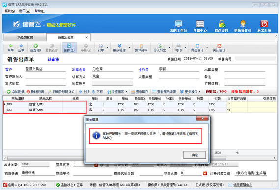 信管飛送貨單軟件、信管飛倉(cāng)庫(kù)管理軟件、信管飛RMS等軟件在新開業(yè)務(wù)單據(jù)時(shí)默認(rèn)在一個(gè)單據(jù)單據(jù)明細(xì)內(nèi)支持同一商品可添加多條記錄(如下圖一所示),部分用戶在開單時(shí)需要設(shè)置在單據(jù)明細(xì)中同一商品不可錄入多行?該如何設(shè)置呢?本篇文章我們以信管飛RMS為例來介紹一下如何設(shè)置開單時(shí)單據(jù)明細(xì)中同一商品不可錄入多行。圖一 銷售出庫(kù)單界面 在功能導(dǎo)航窗點(diǎn)擊“系統(tǒng)管理”—》“系統(tǒng)參數(shù)配置”—》“業(yè)務(wù)參數(shù)”,即可進(jìn)入到“業(yè)務(wù)參數(shù)”配置界面,在業(yè)務(wù)單據(jù)明細(xì)參數(shù)內(nèi)找到“在單據(jù)明細(xì)中同一商品可錄入多行”參數(shù),把這個(gè)參數(shù)的勾選去掉,然后保存,如下圖二所示