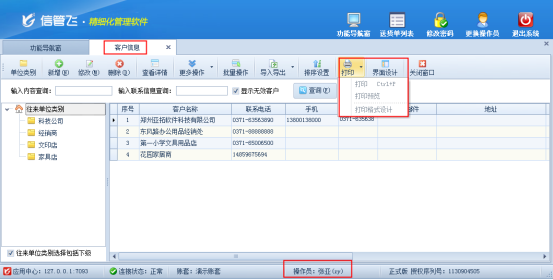 信管飛RMS軟件、信管飛倉(cāng)庫(kù)管理軟件、信管飛送貨單軟件等都支持設(shè)置操作員權(quán)限,以控制操作員登錄軟件所顯示的功能,如公司需要限定操作員僅能查看和選擇自己所屬客戶信息,軟件中可以進(jìn)行控制。 以“信管飛送貨單軟件”為例,示范下如何控制操作員僅能查看所屬為自己的客戶信息。首先需要在客戶信息中進(jìn)行整理下客戶的所屬業(yè)務(wù)員信息,如下圖1所示,示例以員工“張亞”為例。 圖1 設(shè)置好客戶所屬業(yè)務(wù)員后,在功能導(dǎo)航窗選擇“系統(tǒng)管理”—》“操作員及授權(quán)”界面,添加