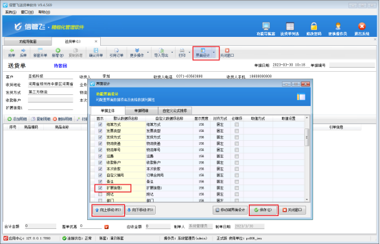 信管飛送貨單軟件支持在送貨單列表界面顯示單據主體的擴展信息,部分用戶在使用軟件過程中可能不知道如何配置,本文以“信管飛送貨單軟件”為例介紹下送貨單列表如何顯示開單界面單據主體的擴展信息? 功能導航欄點“業務處理”-》“新開送貨單”,開單界面中,點擊工具欄“界面設計”,單據主體下勾選“擴展信息1”,上移到可以顯示的位置(中間沒有空余的未勾選選項),點擊“保存”即可,此時開單界面可以看到“擴展信息1”已顯示,如圖所示: 開單輸入單據主體中擴展信息1的內容