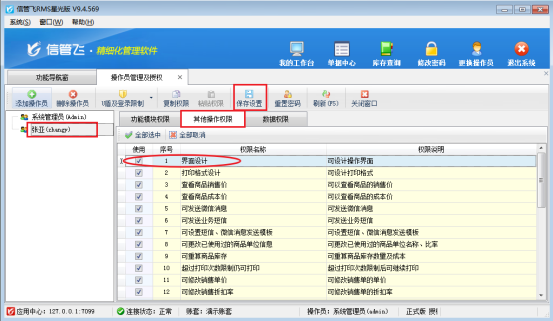 此文章相關演示視頻:界面設計顯示灰色,無法進行界面配置,如何解決演示視頻 信管飛軟件支持增加操作員并且設置操作員權限,部分客戶在單據界面“界面設計”配置界面數據項時出現界面設計按鈕顯示灰色,無法進行界面配置的情況,本文以“信管飛RMS軟件”為例介紹下如何解決這個問題? 出現此問題的原因一般是系統管理員分配操作員權限時沒有勾選界面設計權限導致的,未設置操作界面權限時界面設計按鈕顯示灰色,如圖所示: 切換“