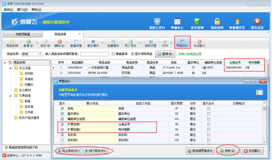 信管飛RMS軟件、信管飛送貨單軟件、信管飛倉庫管理軟件等可以在軟件使用前維護好商品信息,方便開單直接選擇,有客戶存在商品信息除單位、編碼、規格外還有固定的商品屬性比如:生產批號、有效期,軟件的商品信息維護界面支持擴展信息,可以把固定的商品屬性內容輸入在擴展信息中。 在基礎資料—》商品信息中維護好商品的屬性,示例商品“一次性醫用口罩”注冊證號、有效期限維護在“擴展信息1、擴展信息2”中(擴展信息的顯示名稱可以在界面設計中自定義修改),如下圖所示: 商品