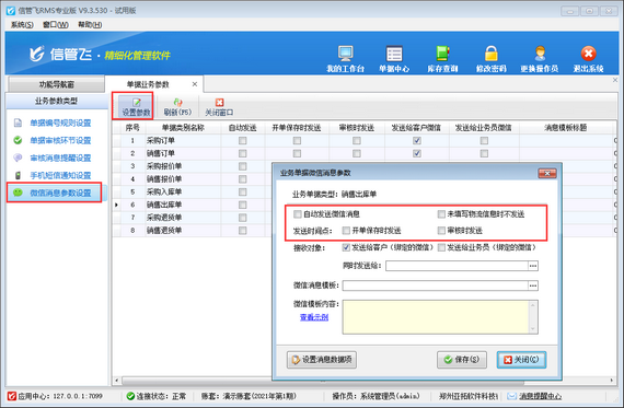 微信消息服務是信管飛軟件基于微信開放平臺研發的業務消息發送服務,支持即時推送業務單據消息,如訂單通知、發貨信息等。支持客戶查看消息詳情(可配置外部查看數據項)、單據簽收確認、分享轉發等功能。 推送微信消息接收人員支持推送給業務員、客戶,系統內支持邀請業務員及客戶綁定微信賬號,業務員及客戶綁定微信賬號后,在軟件內開單時即可對業務員及客戶綁定微信賬號推送業務單據消息。本篇文章介紹一下如何設置自動發送微信消息? 在功能導航窗點擊“系統管理”—》“單據業務參數”,在單據業務參數界面選擇微信消息
