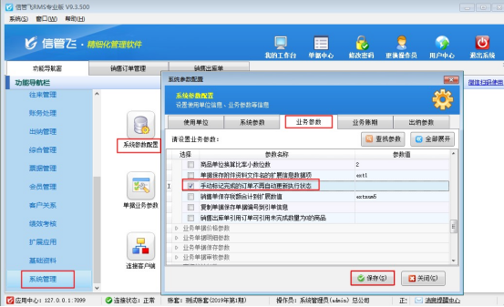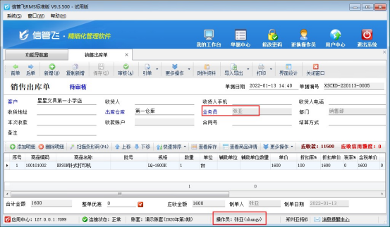 信管飛RMS軟件支持客戶和供應(yīng)商設(shè)置所屬業(yè)務(wù)員,來(lái)管理業(yè)務(wù)員的業(yè)績(jī)情況。在開單選擇客戶后自動(dòng)顯示默認(rèn)的業(yè)務(wù)員和經(jīng)手人,為了避免操作員開單選擇客戶或供應(yīng)商后修改對(duì)應(yīng)的業(yè)務(wù)員或經(jīng)手人信息,軟件支持控制操作員不能修改業(yè)務(wù)員和經(jīng)手人權(quán)限,本文以“信管飛RMS軟件”為例進(jìn)行示范。 使用操作員“張亞”登錄軟件,在沒(méi)有啟用參數(shù)的情況下,開單界面可以修改業(yè)務(wù)員,如下圖所示: 在功能導(dǎo)航窗點(diǎn)擊“系統(tǒng)管理”—》“系統(tǒng)參數(shù)配置”,點(diǎn)擊“業(yè)務(wù)參數(shù)”勾選啟用參數(shù)“啟用業(yè)務(wù)單據(jù)