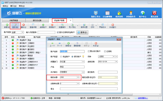 部分試用出納記賬軟件的用戶,在修改日記賬憑證時(shí),會(huì)提示“當(dāng)前憑證為賬戶期初余額自動(dòng)生成,請(qǐng)?jiān)谫Y金賬戶管理中進(jìn)行修改”,憑證無(wú)法直接修改,如下圖所示。 這是因?yàn)楫?dāng)前憑證是新增資金賬戶時(shí)錄入期初余額自動(dòng)生成的,如需修改,請(qǐng)?jiān)诠δ軐?dǎo)航窗點(diǎn)擊“基礎(chǔ)資料”—》“資金賬戶”打開資金賬戶管理界面,修改賬戶信息,修改期初余額數(shù)據(jù)即可,修改后,憑證可自動(dòng)更新,如下圖所示。 歡迎下載試用這款簡(jiǎn)單易用的出納記賬軟件:信管飛出納記賬軟件。