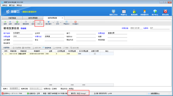 信管飛RMS最新版本V9.3.500增加參數(shù)“發(fā)票審核后更新相關(guān)單據(jù)的開票狀態(tài)”,同時(shí)也支持設(shè)置操作員發(fā)票審核權(quán)限,本篇文章介紹一下進(jìn)銷存管理軟件中如何設(shè)置操作員不可審核發(fā)票。 在功能導(dǎo)航窗點(diǎn)擊“系統(tǒng)管理”—》“操作員及授權(quán)”,打開操作員管理及授權(quán)界面,選擇操作員“張亞”,在其右側(cè)的功能模塊權(quán)限內(nèi)選擇“往來(lái)管理”模塊,將“進(jìn)/銷項(xiàng)發(fā)票管理”的“審核”權(quán)限勾選取消,然后保存設(shè)置,如下圖所示。 操作員權(quán)限設(shè)置完成后,關(guān)閉當(dāng)前窗口,更換操作員“張亞”登錄軟件,打開“往來(lái)管理”—》“銷項(xiàng)發(fā)票管