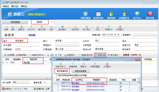 信管飛送貨單軟件是一款集訂單、送貨單、退貨單、應(yīng)收款管理為一體的送貨打印軟件,軟件支持退貨單直接引用送貨單進(jìn)行退貨處理,也支持直接開退貨單,有時(shí)需要退貨價(jià)格和送貨價(jià)格一致,為了方便退貨查看送貨價(jià)格,軟件支持在退貨單界面選擇價(jià)格處顯示最近的送貨單價(jià)格,本文進(jìn)行示范下如何操作。 在功能導(dǎo)航窗點(diǎn)擊“系統(tǒng)管理”—》“系統(tǒng)參數(shù)配置”,把“業(yè)務(wù)參數(shù)”中的“退貨單在選擇價(jià)格窗口顯示最近送貨單”參數(shù)啟用保存,如下圖所示: 參數(shù)保存完成后,打開“業(yè)務(wù)處理”的新開退貨單