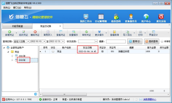 信管飛出納記賬軟件是一款針對(duì)各類企事業(yè)單位財(cái)務(wù)出納記賬開發(fā)的,集現(xiàn)金日記賬記賬與點(diǎn)驗(yàn)、銀行日記賬記賬與核帳、應(yīng)收應(yīng)付往來(lái)賬管理、票據(jù)管理(支票管理、承兌匯票管理)、發(fā)票管理、工資管理、員工借款管理、費(fèi)用報(bào)銷管理等為一體的出納管理軟件。 軟件支持一直記錄資金賬戶的憑證信息,數(shù)據(jù)自動(dòng)保存,有客戶需要登記新一年日記賬時(shí),打開界面不顯示2022年,不清楚如何顯示出來(lái),本文示范下如何操作? 出納軟件在登記新的一年日記賬,打開日記賬界面默認(rèn)沒(méi)有新一年2022年列