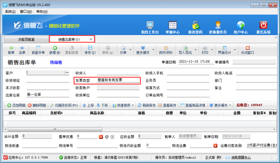 信管飛RMS軟件支持開銷售單選擇發(fā)票類型,可以根據(jù)實際需要選擇不同的開發(fā)票方式。在企業(yè)的經(jīng)營管理過程中,為了快速開單,提高效率,有時需要對單據(jù)設(shè)置默認值。本篇文章中以信管飛RMS軟件專業(yè)版為例詳細介紹下如何設(shè)置單據(jù)默認發(fā)票類型。在功能導(dǎo)航窗點“銷售管理”—》“銷售出庫單”,進入銷售出庫單界面,點擊“更多操作”按鈕,找到“設(shè)置單據(jù)默認值”,如下圖所示: 點擊“設(shè)置單據(jù)默認值”,系統(tǒng)彈出“設(shè)置單據(jù)默認值”窗口。在“設(shè)置單據(jù)默認值”窗口,可勾選“啟用單據(jù)默認值”,選擇需要設(shè)置的默認發(fā)票類型后點擊“保存”按鈕進行保存。如下圖所示