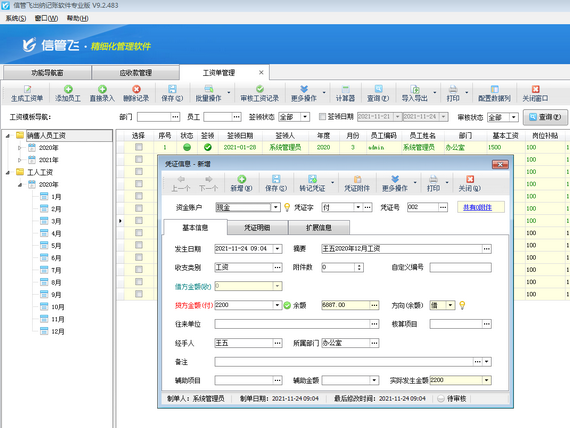 信管飛出納記賬軟件專業(yè)版包括工資管理功能,支持自定義工資模板,可根據(jù)設(shè)置的工資模板快速生成工資單,支持從上月工資單復(fù)制工資項目數(shù)據(jù),每月工資發(fā)放后,可將工資記錄轉(zhuǎn)記為日記賬憑證,本文介紹一下出納記賬軟件中工資單如何轉(zhuǎn)記憑證? 在功能導(dǎo)航窗點擊“綜合管理”—》“工資單管理”,打開工資單管理界面,在工資記錄列表中選擇需要轉(zhuǎn)記日記賬的工資記錄,然后點擊“更多操作”—》“轉(zhuǎn)記憑證(發(fā)現(xiàn)金)/轉(zhuǎn)記憑證(銀行代發(fā))”,系統(tǒng)彈出提示信息“您是否需要將當前工資記錄轉(zhuǎn)記為日記賬憑證?”,如下圖所示。 點