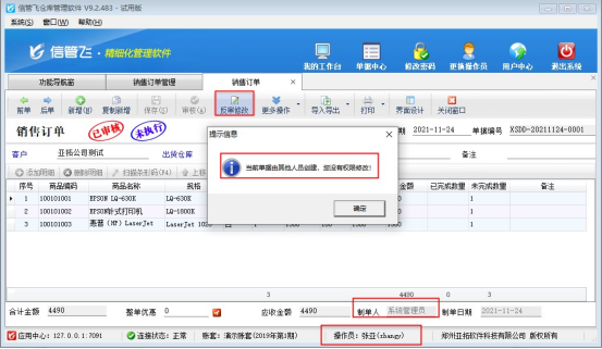 信管飛系列軟件支持新增操作員和設(shè)置操作員權(quán)限,軟件可登錄多個操作員,為避免操作員之間開的訂單被修改,軟件支持控制操作員不能修改其他人開的訂單,本文以“信管飛倉庫管理軟件銷售訂單”為例,示范如何控制操作員不能修改其他人開的訂單。 在功能導(dǎo)航窗點擊“系統(tǒng)管理”—》“操作員及授權(quán)”,打開操作員及授權(quán)界面,選擇操作員組的操作員“張亞”,在右側(cè)功能權(quán)限選擇“數(shù)據(jù)權(quán)限”,把銷售訂單對應(yīng)的權(quán)限“可修改有查看權(quán)限的數(shù)據(jù)”取消勾選,然后保存配置,如下圖所示: 權(quán)限設(shè)置